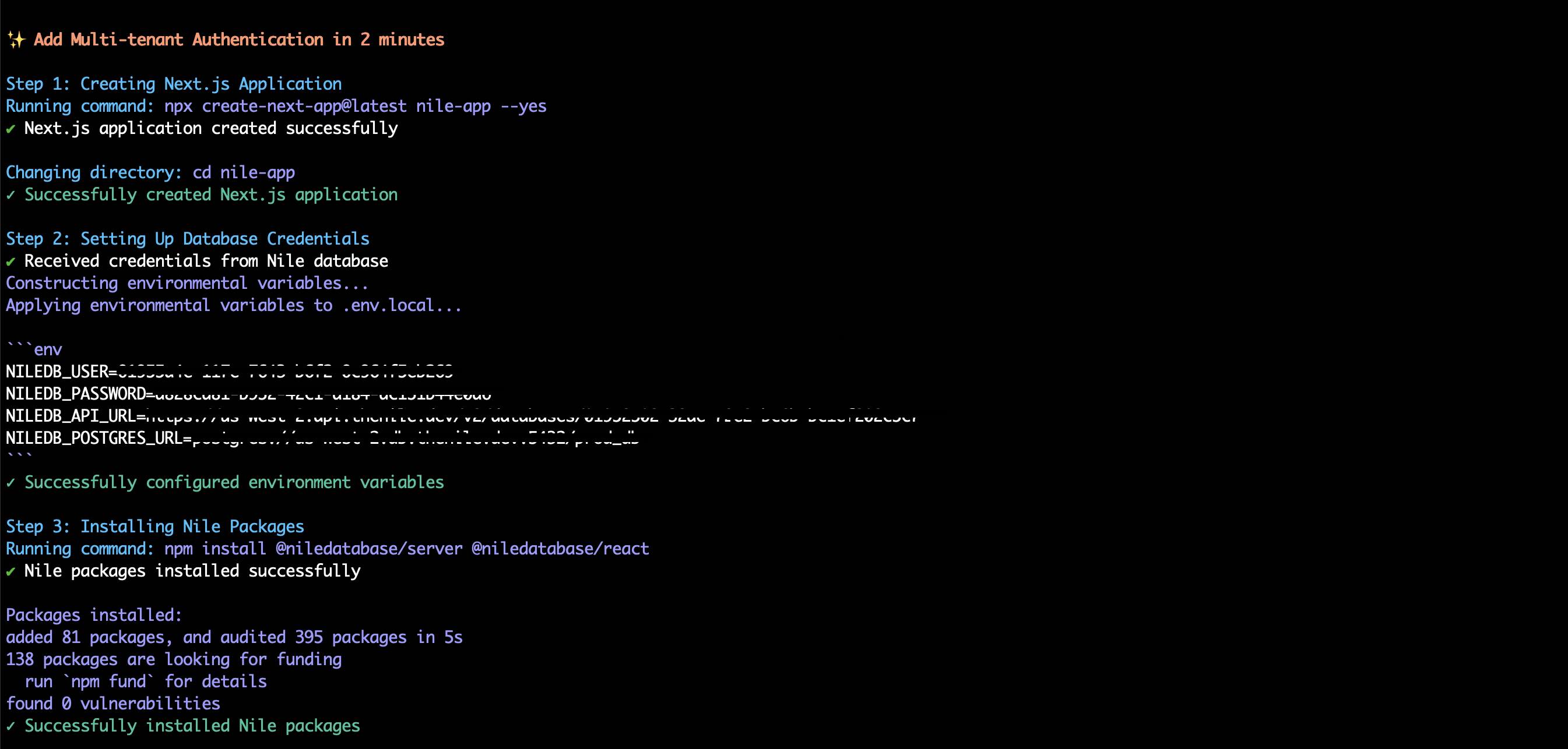 The quickstart command helps you create a new application with Nile authentication pre-configured. Currently supports Next.js applications.Creating a Next.js Application with Authentication