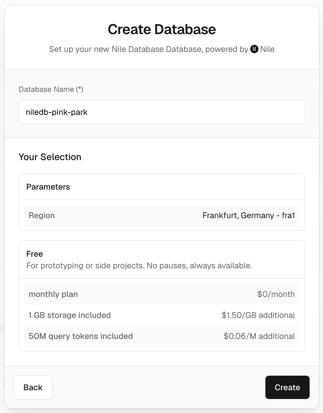 You can use the same database for all environments, or use separate databases for development and production. You can create additional Nile databases from this screen, if needed, with the create database button.